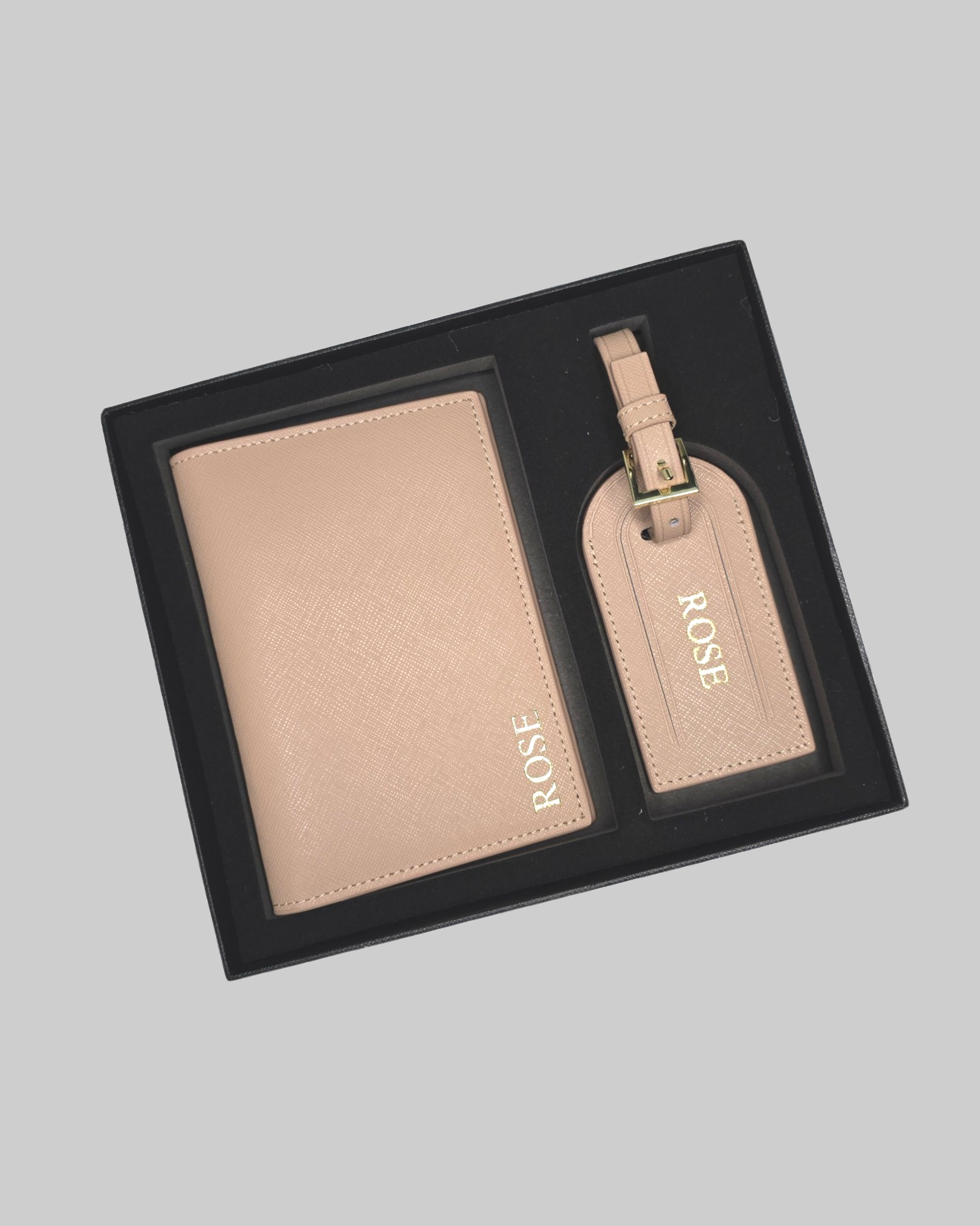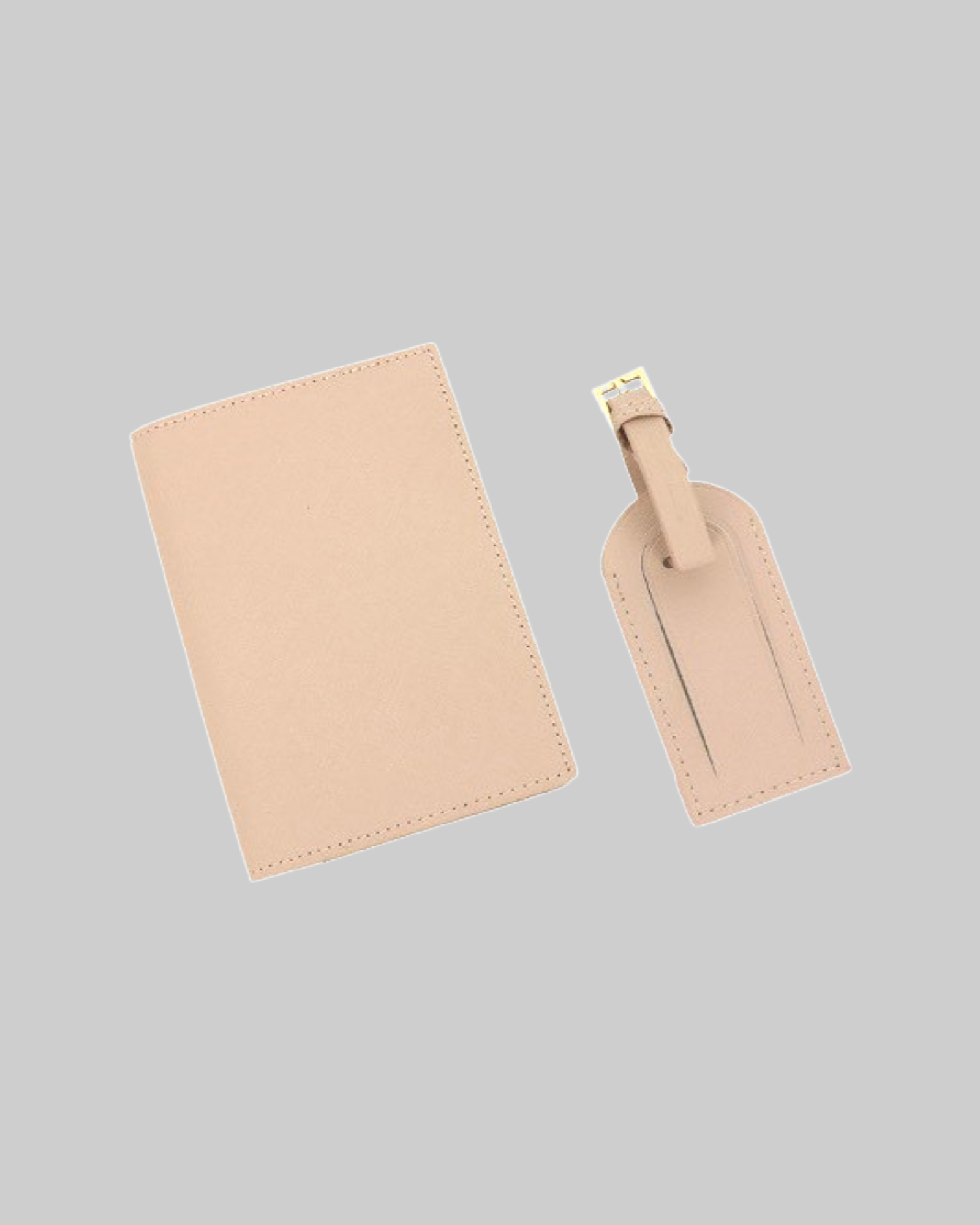 Elevate your luggage game with the Eleanor Luggage Tag & Passport Holder set in neutral taupe. This set comes in a branded gift box.